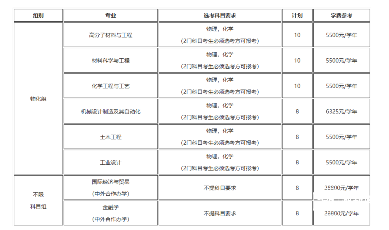 如浙大城市学院今年有4个招生专业,其中3个专业报考要求选考科目要求为物理、化学,1个专业报考要求选考科目要求化学;浙大宁波理工学院除了中外合办专业外,所有招生专业报考选考科目要求为物理、化学;浙江水利水电学院、杭州医学院的招考专业也都要求物化同选。