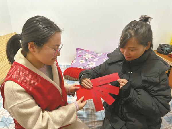 之后,“心心点灯”项目志愿者和堇天社区妇联执委带着这份沉甸甸的心意敲开了孙文娟的家门。大家围坐在她身边,详细询问她的伤情恢复情况。项目志愿者将服务“送货上门”,大大的“百宝袋”里装着心理解压、情绪疏导、政策帮扶及法律援助服务卡。“困难只是暂时的,我们都是一家人,有需要随时说话。”志愿者和堇天社区妇联执委为孙文娟送上了深深的节日祝福。
