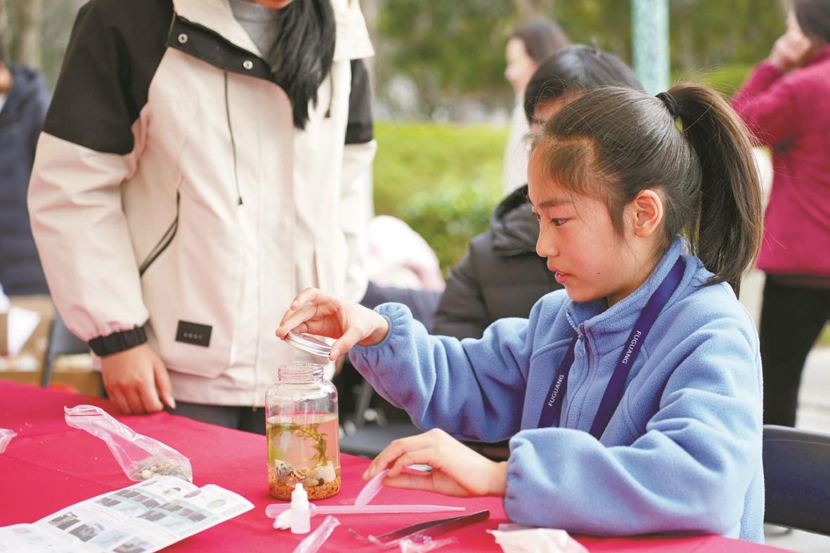 鸟屋拼装、微景观DIY等手作区座无虚席。五年级的小刘作为公益小摊主,正指导小朋友拼装鸟屋:“第一次当小老师,既紧张又自豪,还拿到了社会实践证书和义务植树证书,这个植树节过得特别有意义!”