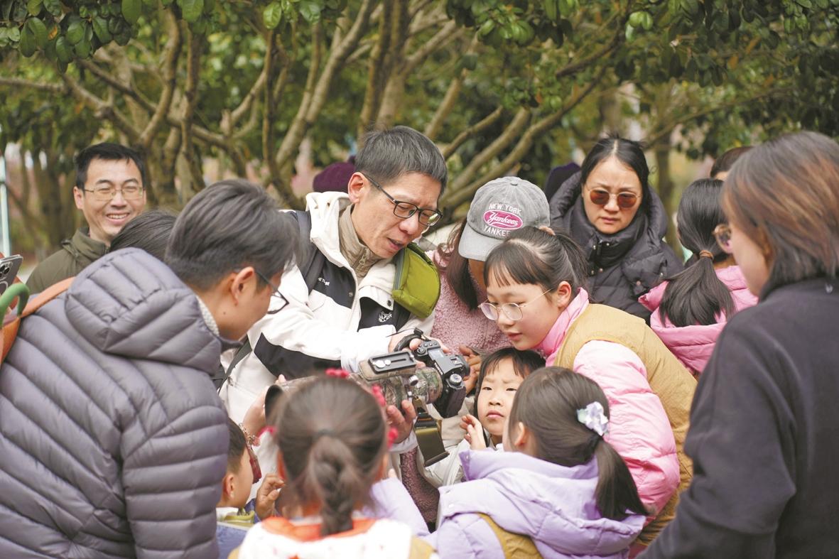 张海华(中)带领20组家庭完成“寻花、观鸟、识虫”任务。记者周星宇 摄