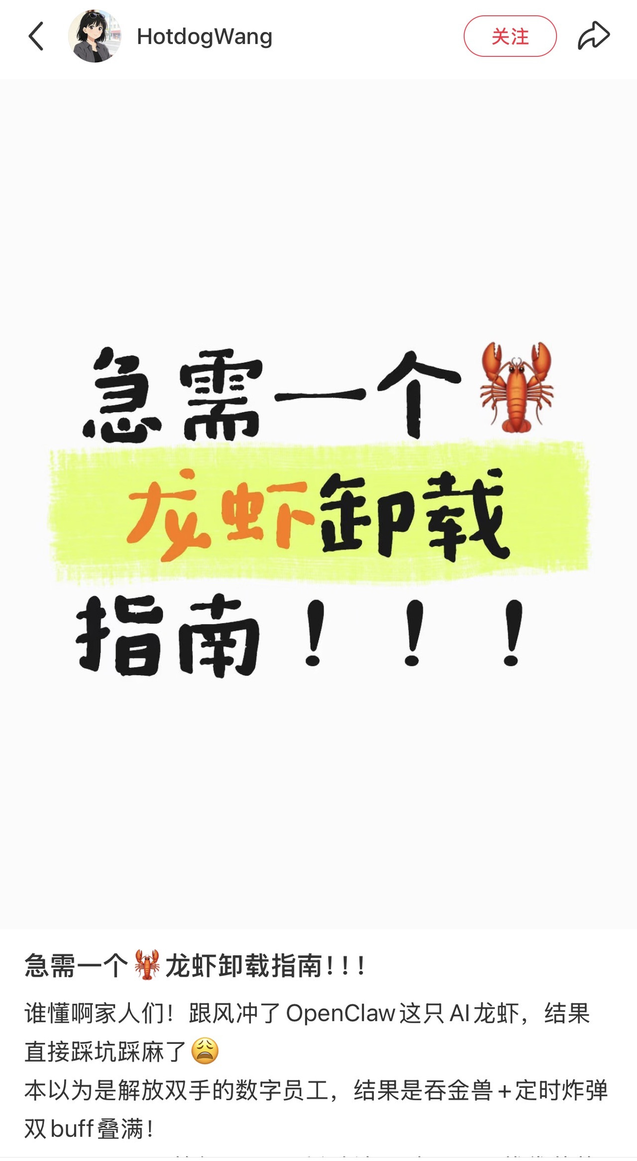 “好不容易装上了,token烧得比流水还快,月薪两万根本养不起,后台跑几天任务,钱包直接被掏空。更吓人的是安全问题,零认证暴露公网就算了,插件还藏恶意代码,连AI安全专家都被删过邮件,咱普通人根本扛不住这风险。”网友“Hotdogwang”发帖表示,折腾半天发现完全不适合自己,想卸载还发现不是拖进回收站就行,这龙虾卸起来也太费劲了!