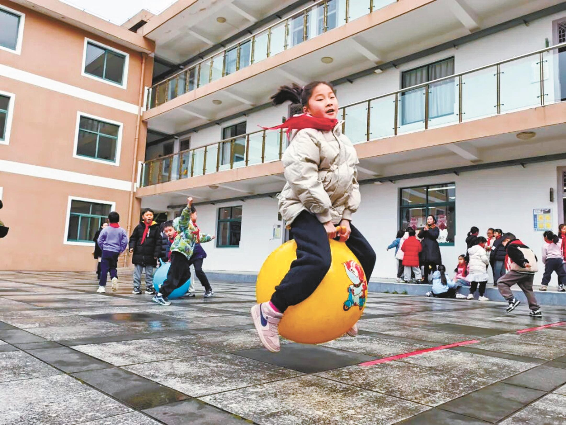 慈溪市第三实验小学学生在大课间玩羊角球。(学校供图)