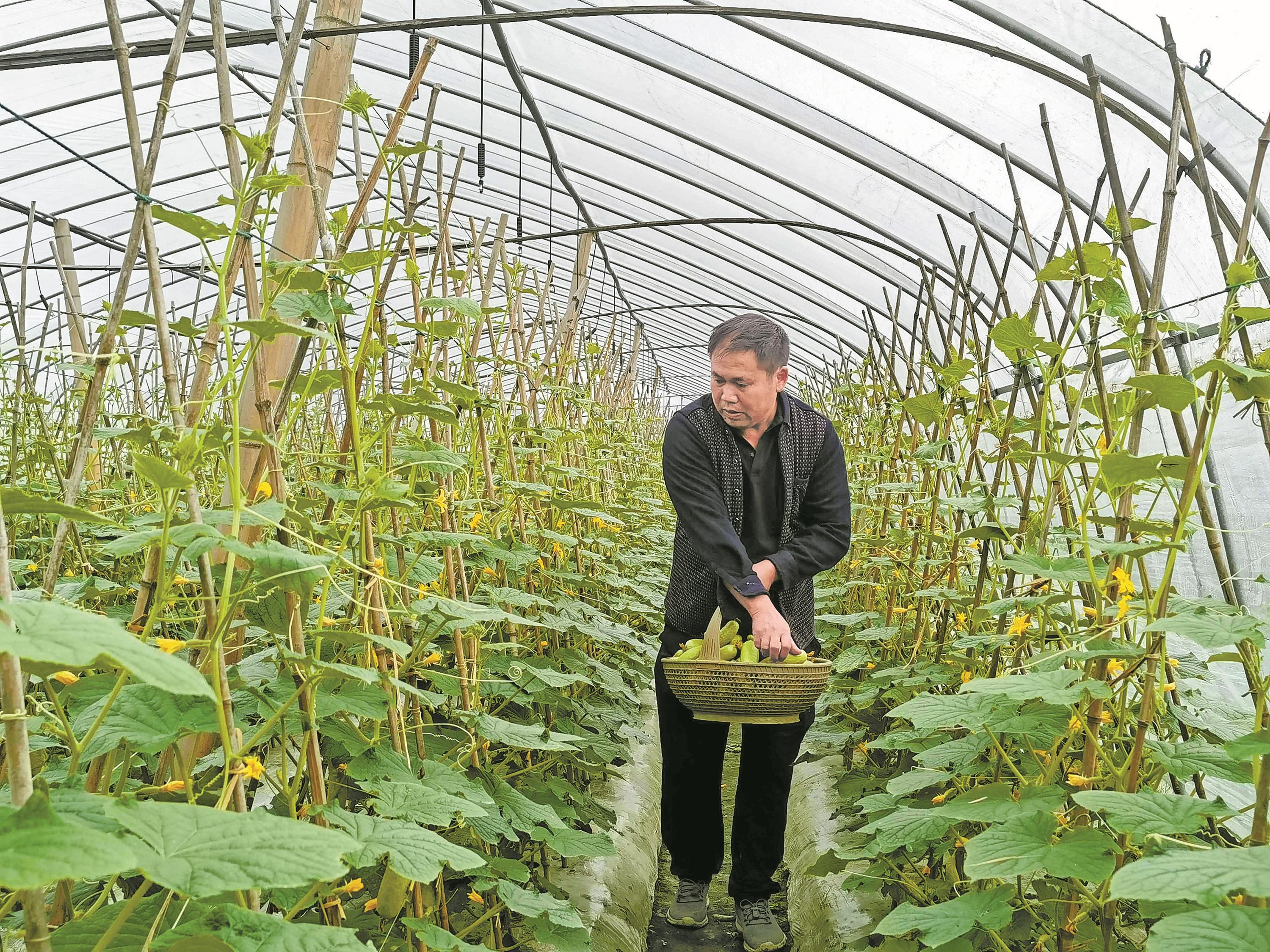 朱晓华正在采摘减脂黄瓜。