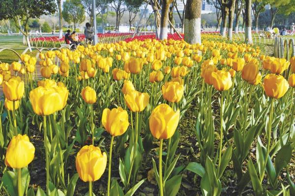 鄞州公园:公园一期东端打造了2700平方米的郁金香模纹花坛,种植孟菲斯、长安、水晶美人等7个品种、4万余株郁金香,红似火、粉如霞、黄若鎏金,色彩层次丰富。