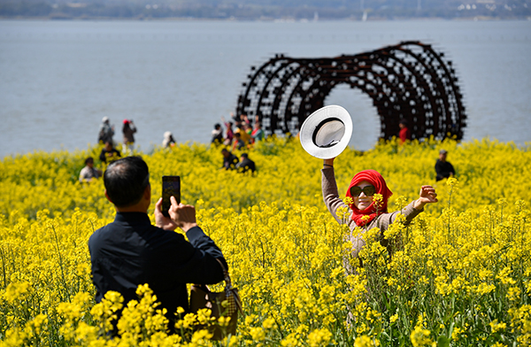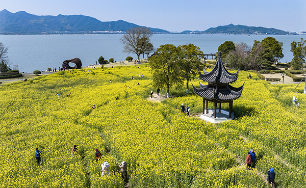沙山路的油菜花开得正盛,13亩的金色花海铺满了湖畔的缓坡,热烈拥抱每一缕晨光,休息日约有近千名游客前来打卡拍照。