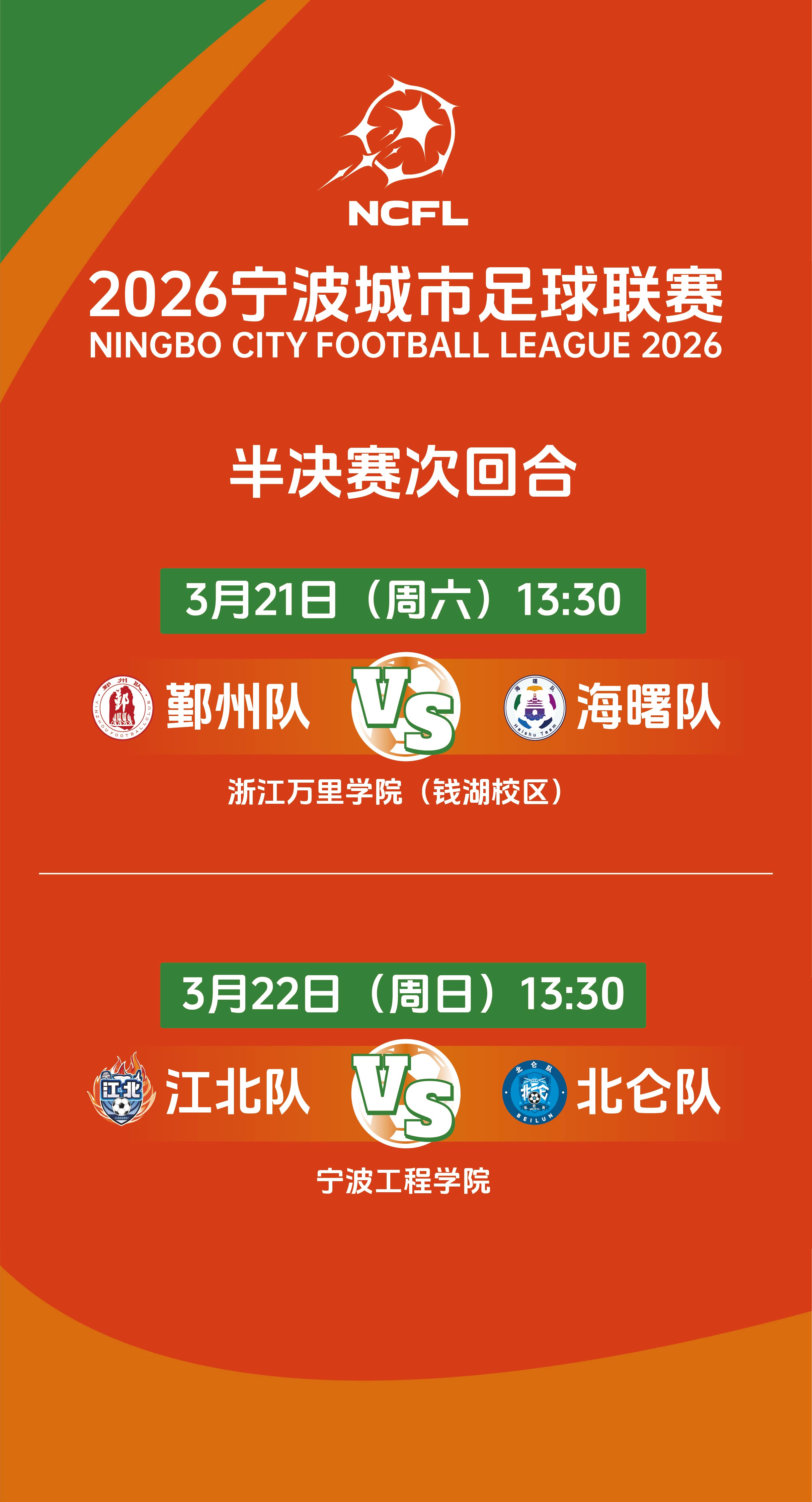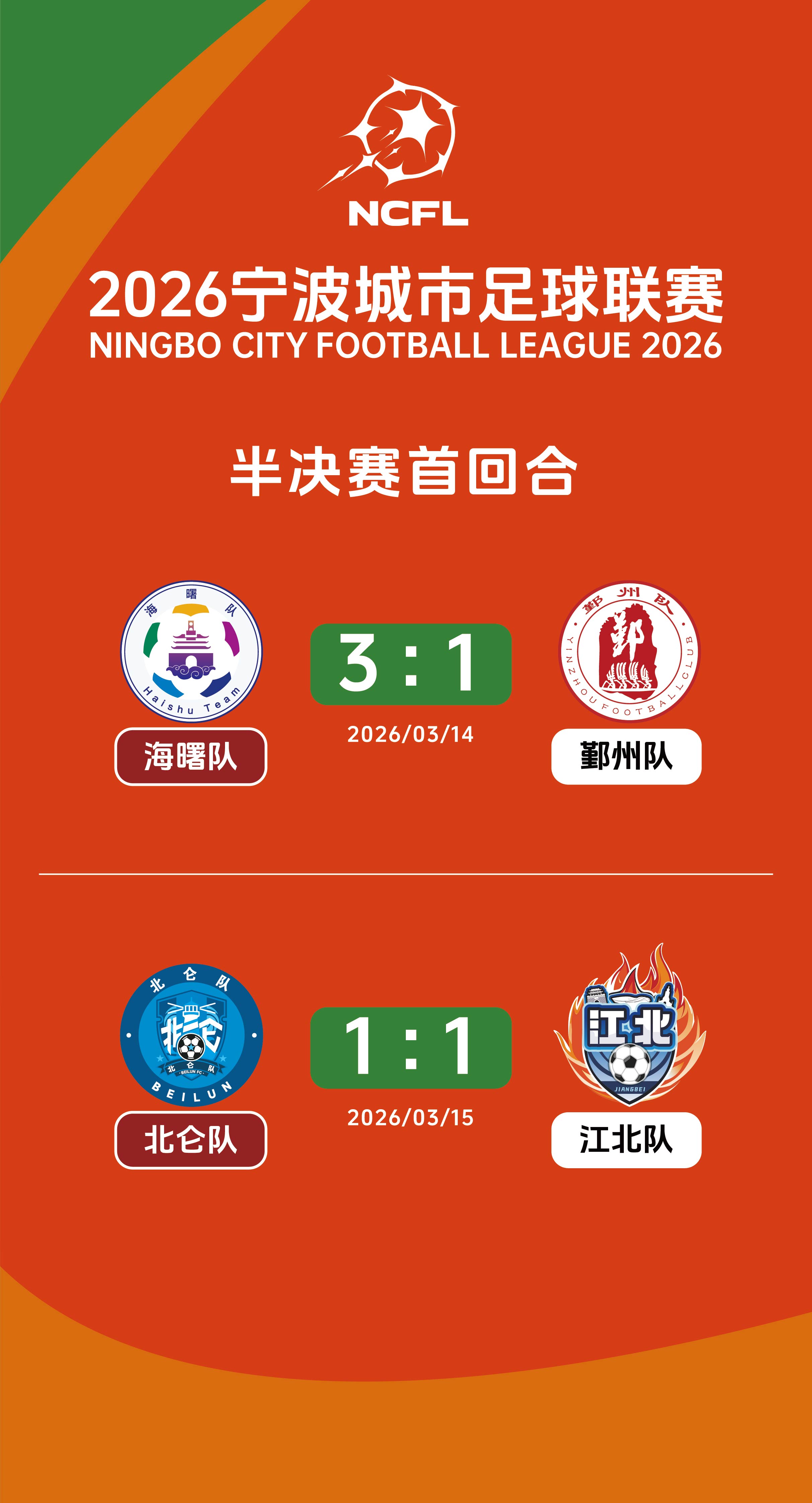 3月15日,2026年宁波城市足球联赛半决赛首回合第二场比赛在宁波大学梅山校区进行,北仑队坐镇主场迎战江北队,双方以1比1握手言和。前一天进行的半决赛首回合另一场较量中,海曙队主场以3比1战胜鄞州队。半决赛第二回合将于3月21日和22日进行,目前海曙队占据先机。