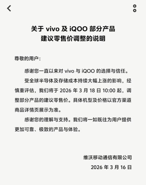 对此,vivo方面给出了标准且“高情商”的官方回应:“vivo一直致力于为用户提供高品质的产品,我们正在积极评估供应链波动带来的影响。任何关于产品价格政策的更新,请以我们官方渠道的公示为准。”