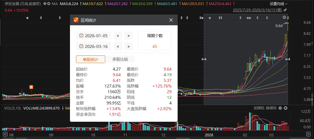3月16日,京投发展再次斩获涨停板,报收9.64元/股;最新市值为71.41亿元。今年以来,京投发展股价累计涨幅达125.76%。