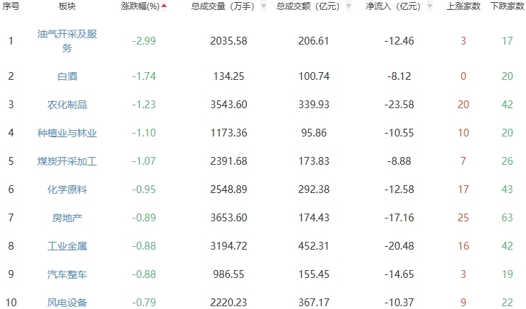 板块方面,通信服务、元件、通信设备等板块涨幅居前,油气开采及服务、白酒、农化制品等板块跌幅居前。