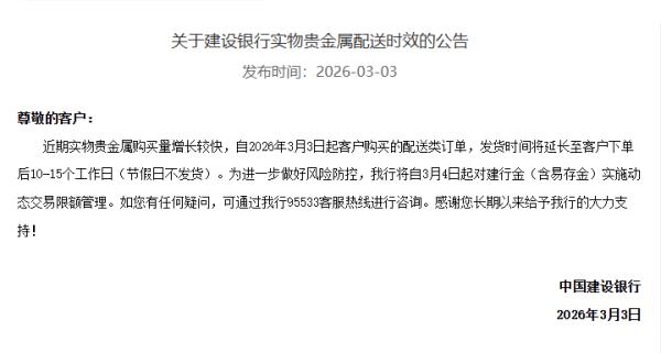 同时,公告还提到,近期实物贵金属购买量增长较快,自2026年3月3日起客户购买的配送类订单,发货时间将延长至客户下单后10-15个工作日(节假日不发货)。
