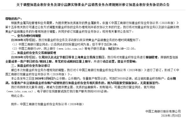 工商银行此前也发布公告,宣布自2026年2月7日起,在周末以及法定节假日等非上海黄金交易所交易日,该行将对如意金积存业务进行限额管理,限额类型包括全量或单一客户单日积存/赎回上限、单笔积存或赎回总量上限等,并进行动态设置,提金不受影响。