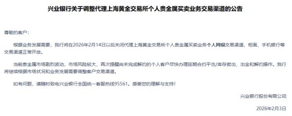 兴业银行表示,2026年2月14日以后关闭代理上海黄金交易所个人贵金属买卖业务个人网银交易渠道,柜面、手机银行等交易渠道正常开放。并再次提醒尚未完成解约的个人客户尽快办理延期合约平仓/库存卖出、出金和解约操作。