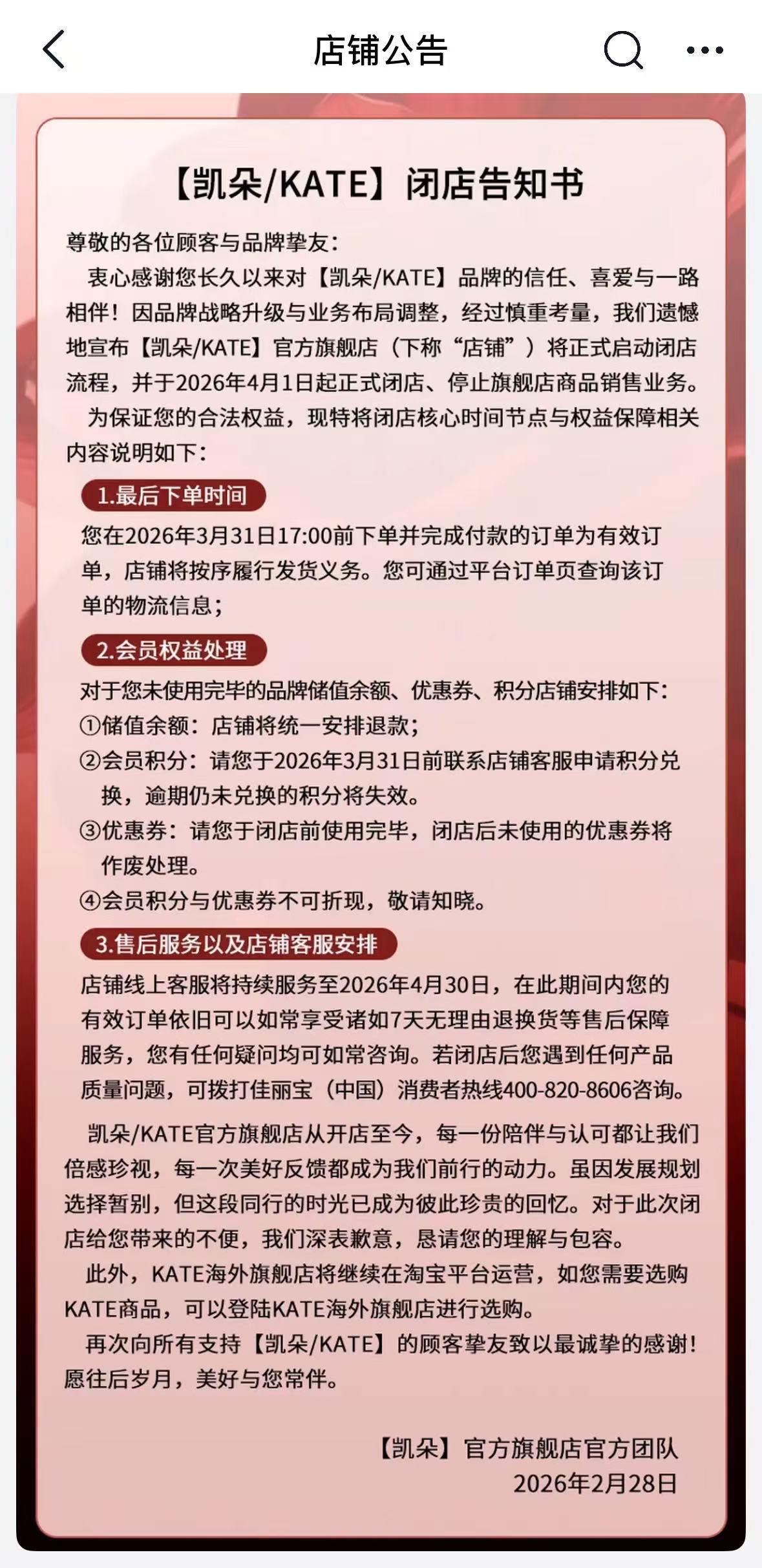 根据店铺发布的公告,品牌已针对消费者权益做出明确安排:持有品牌积分、储值余额尚未使用的用户,需在2026年3月31日前联系客服办理积分兑换、余额原路退回;店铺线上客服将持续服务至2026年4月30日,在此期间的有效订单仍可享受7天无理由退换货等售后保障。