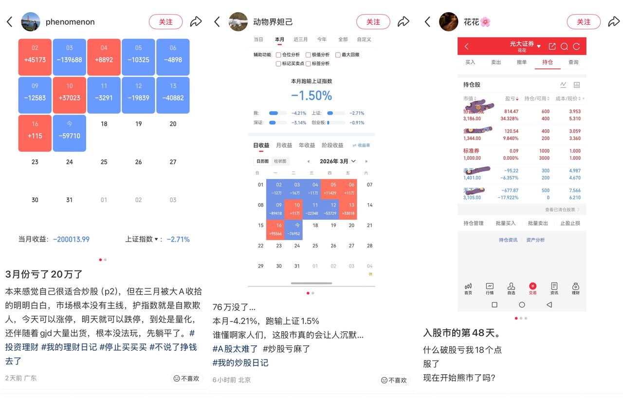上海股民王先生平复许久才发出一条帖子:“收盘了,大家都亏麻了吧?”短短十分钟内,就引来数十位股民跟评吐槽,“今天账户全绿,一只红的都没有”“像是被股市无差别暴打了一顿,身心俱疲”。还有股民慌乱之中把发帖日期误写成3月18日,直言“跌得人都懵了,日子都记不清了”。北京一位股民更是晒出硬核亏损明细,本月账户直接缩水76万,整体跌幅4.21%,即便跑赢上证指数1.5个百分点,依旧难掩巨额亏损的剧痛。