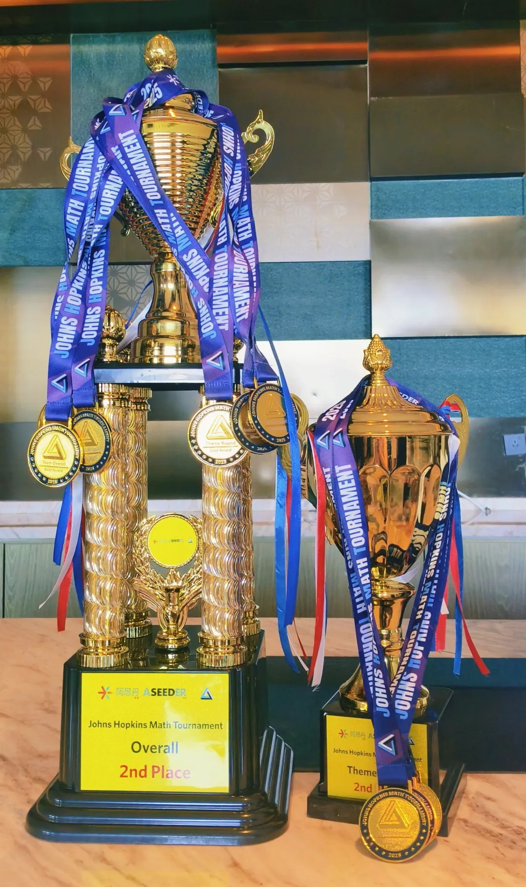 李曜辰在国际赛事中获得的奖杯。学校供图