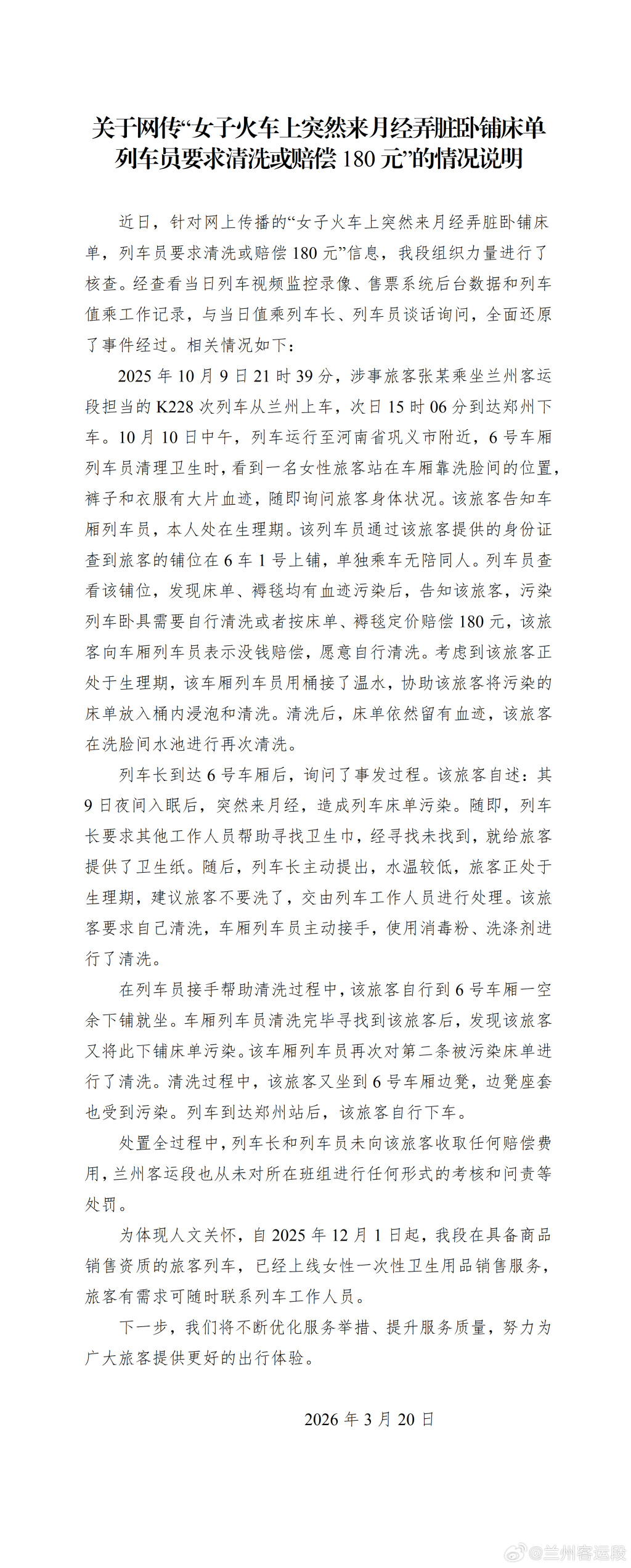女子月经弄脏卧铺床单被要求赔偿180元?铁路部门回应