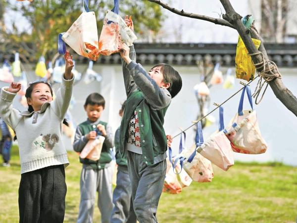 近日,镇海区启迪幼儿园组织180名幼童,前往江南第一学堂开展非遗主题研学,让孩子们在行走和体验中了解和学习传统文化。孩子们聆听百年学堂历史讲解,沉浸式体验漆扇、扎染、竹编等非遗项目,在动手实践中感受传统技艺的魅力。图为孩子们在晾晒扎染布袋。