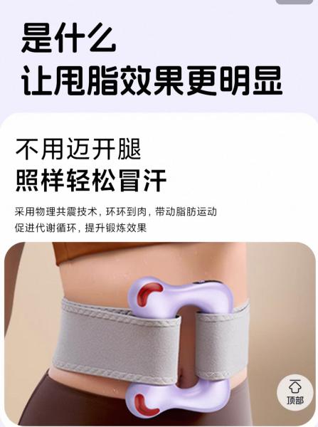 筋膜环则是最近两三年活跃的产品。相关宣传中称,这类产品可以通过高频振动穿透筋膜层,刺激脂肪振动,“不用迈开腿,照样轻松冒汗”。其中,有些产品方表示,筋膜环通过带动脂肪运动,促进代谢循环,从而提升锻炼效果。也有产品方宣传称,筋膜环放在腹部可以同时按摩多个穴位,帮助减肥。