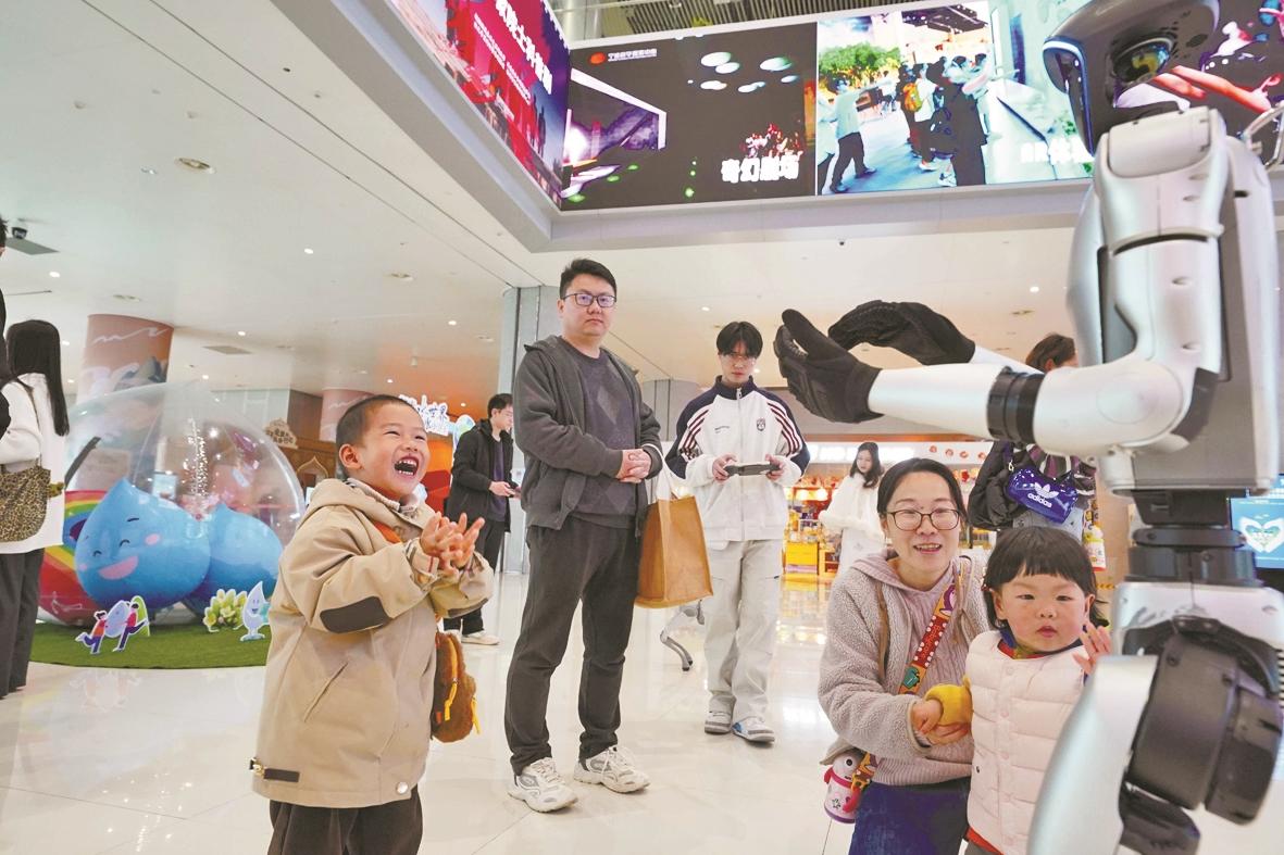 小朋友和宇树科技机器人互动。