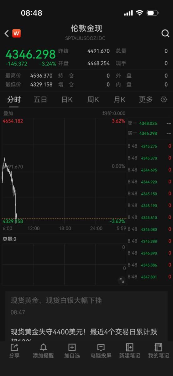截至早上8:48分发稿时,伦敦现货黄金大跌3.24%,暂报4346美元/盎司附近。