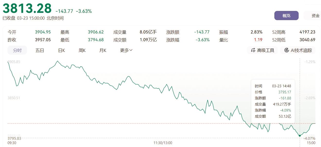 3月23日,A股三大指数集体低开走弱,沪指盘中击穿3900点和3800点两大整数关口。截至收盘,沪指跌3.63%,险守3813.28点;深证成指跌3.76%,报13345.51点;创业板指跌3.49%,报3235.22点。沪深京三市成交额超2.4万亿元,较上一交易日放量超1500亿元。