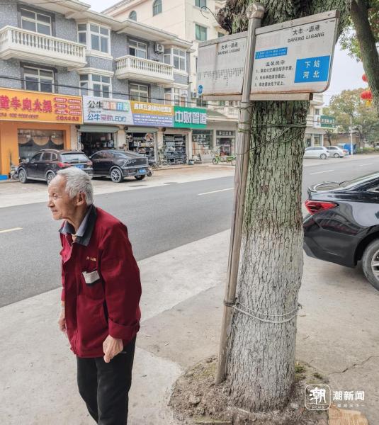 陈阿重老伯在候车站牌旁。潮新闻记者 肖暖暖 摄