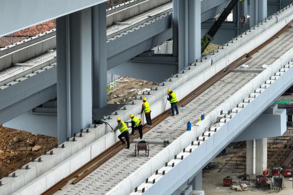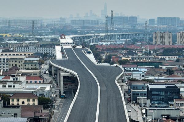 该项目上层为城市快速路,已经开始摊铺沥青,中间层为轨道交通10号线(慈溪线),工人正忙着轨道铺设,双层高架已初具规模。