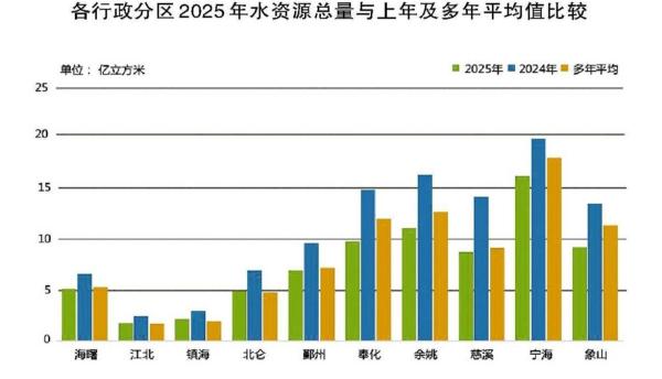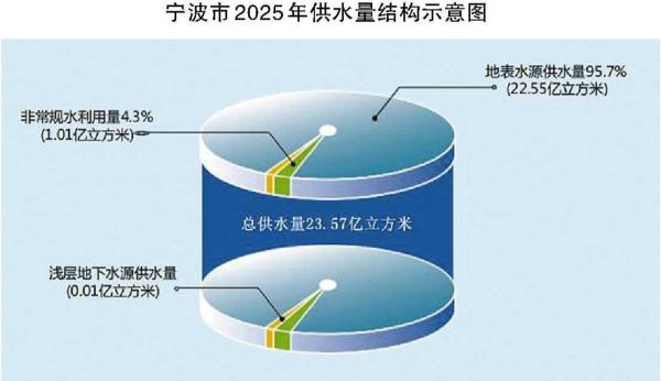 2025年宁波市总供水量为23.57亿立方米,较上年增加1.8%,其中,地表水源供水量为22.55亿立方米,占总供水量的95.7%;非常规水利用量为1.01亿立方米,占总供水量的4.3%;浅层地下水源供水量为0.01亿立方米。