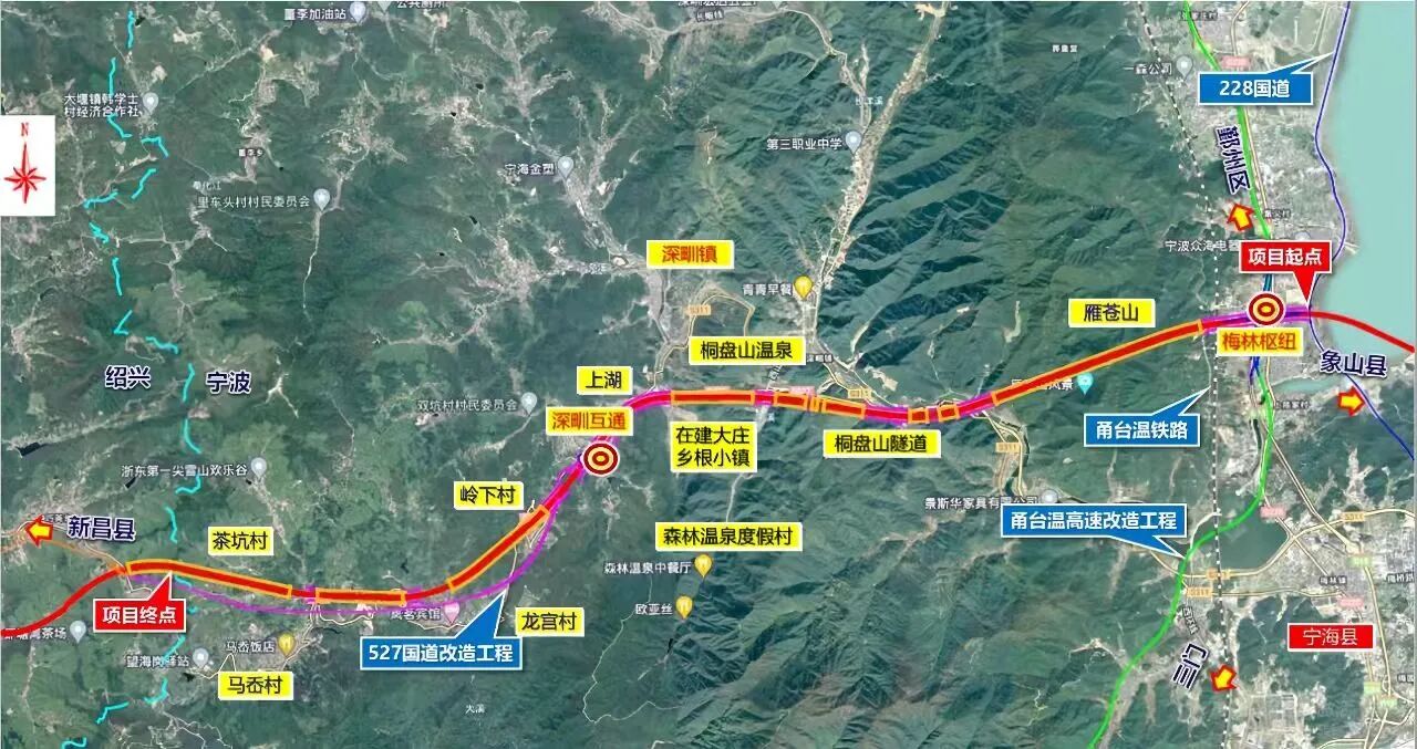 现因可行性研究阶段发现原梅林枢纽可实施性较差,调整项目起点至西店镇沈海高速设西店枢纽,接规划象山至宁海高速,向西经梅林街道、深甽镇,终于甬绍界上三坑隧道,接甬金衢上高速规划绍兴段。
