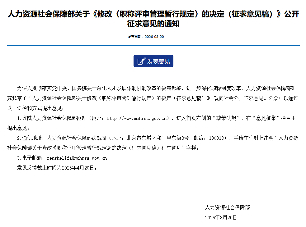 近日,人力资源和社会保障部研究起草了《人力资源社会保障部关于修改〈职称评审管理暂行规定〉的决定(征求意见稿)》(以下简称《征求意见稿》)。本次修改聚焦强化评审监管、加强信用管理、完善评审要求等重点问题,共修改《暂行规定》条文10条、新增条文5条↓↓↓