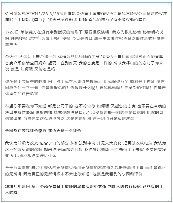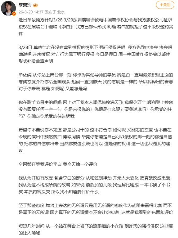 3月29日下午,李荣浩公开喊话单依纯,称对方在李荣浩方婉拒翻唱授权的情况下,强行侵权演唱《李白》。
