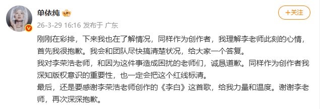 刚刚,单依纯发文回应:“刚刚在彩排,下来我也在了解情况,同样作为创作者,我理解李老师此刻的心情,首先我很抱歉。我会和团队尽快搞清楚状况,给大家一个答复。