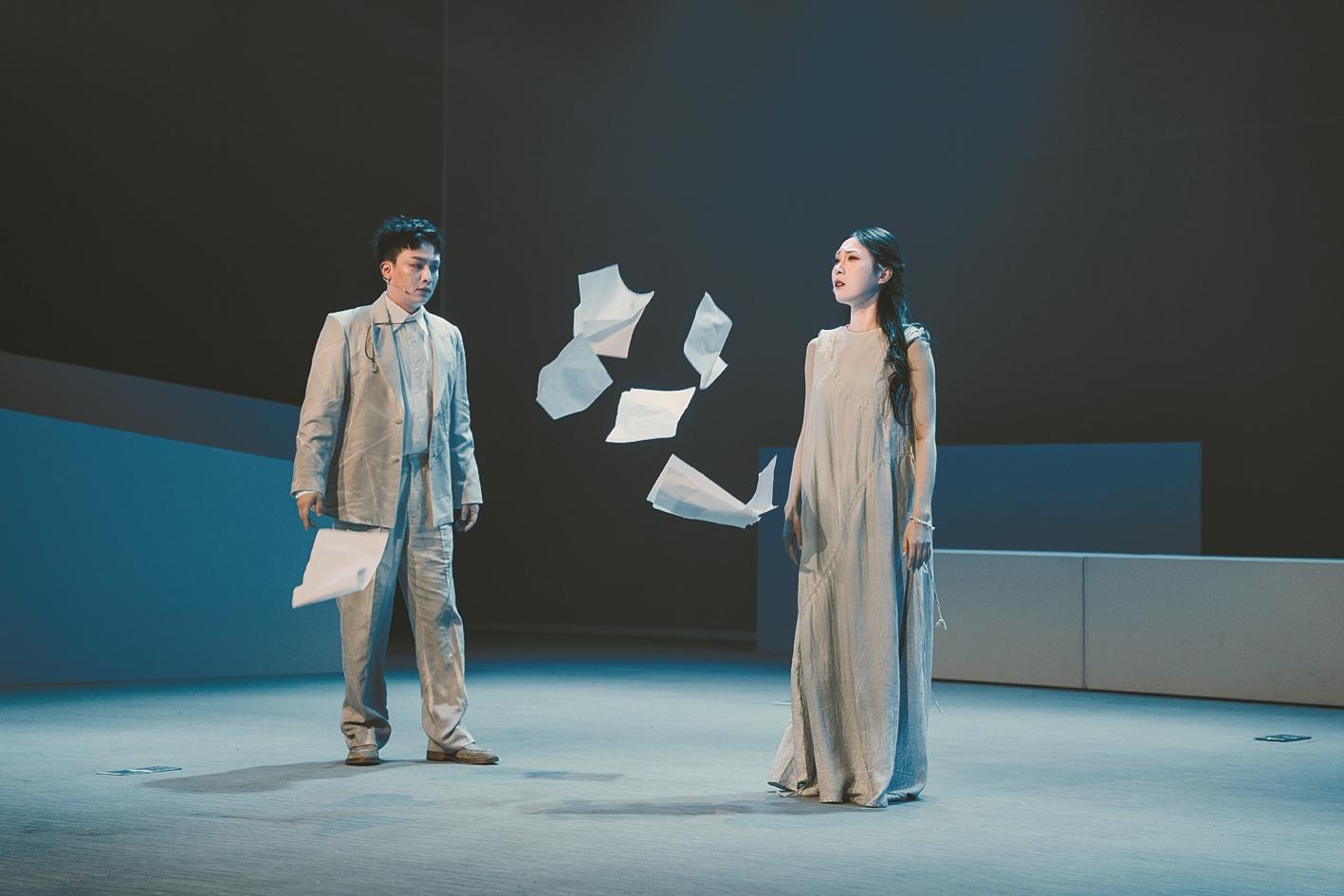 另一方面,剧目又大胆融入了音乐剧、现代舞等多种艺术形式,构成了丰富的舞台语汇。其中,四首由宁波本土音乐人原创的歌曲《指挥棒》《困在旧辰光》《老屋故事》《勇敢的回响》更是贯穿全剧,以贴合人物心境与剧情走向的歌词、旋律,让观众在戏曲唱腔之外,通过流行的音乐形式共情人物的情感起伏。