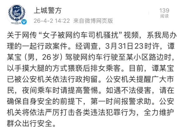 杭州市公安局上城分局4月2日通过其官方微博@上城警方 发布通报:关于网传“女子被网约车司机骚扰”视频,系我局办理的一起行政案件。经调查,3月31日23时许,谭某宝(男,26岁)驾驶网约车行驶至某小区路边时,以手摸大腿的方式猥亵后排女乘客。目前,谭某宝已被公安机关依法行政拘留。公安机关提醒广大市民,夜间乘车时请提高警惕。如遇不法侵害,请在确保自身安全的前提下,第一时间报警求助。公安机关将依法严厉打击各类违法犯罪行为,全力维护群众出行安全。