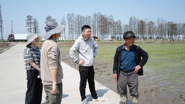 在现场,宁波市农技推广总站工作人员仔细查看插秧情况,针对一些耕种问题与农场负责人展开深入交流,并给予技术指导。