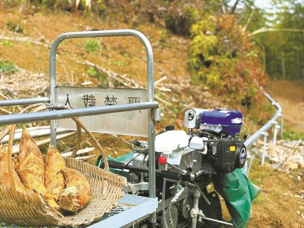 轨道运输车载着春笋驶向山脚。(蔡银欣 顾佳诚 摄)