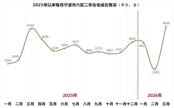 3月份市六区二手房成交量是宁波楼市深度调整的这5年间月度第四高量,仅次于疫情结束后购房需求集中释放的2023年3月,以及当时有购房补贴政策到期因素影响的2024年6月和12月。
