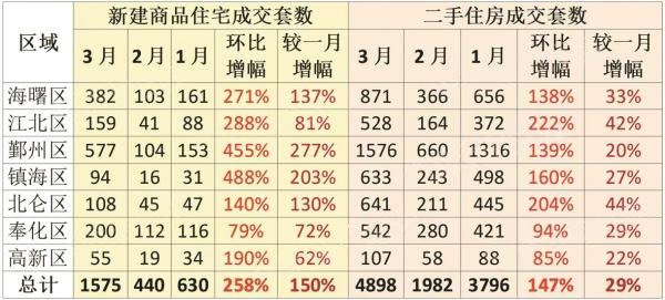 市区各地3月份新房、二手房的成交量,环比增幅都非常大,与一月份相比也都是红彤彤的一片。