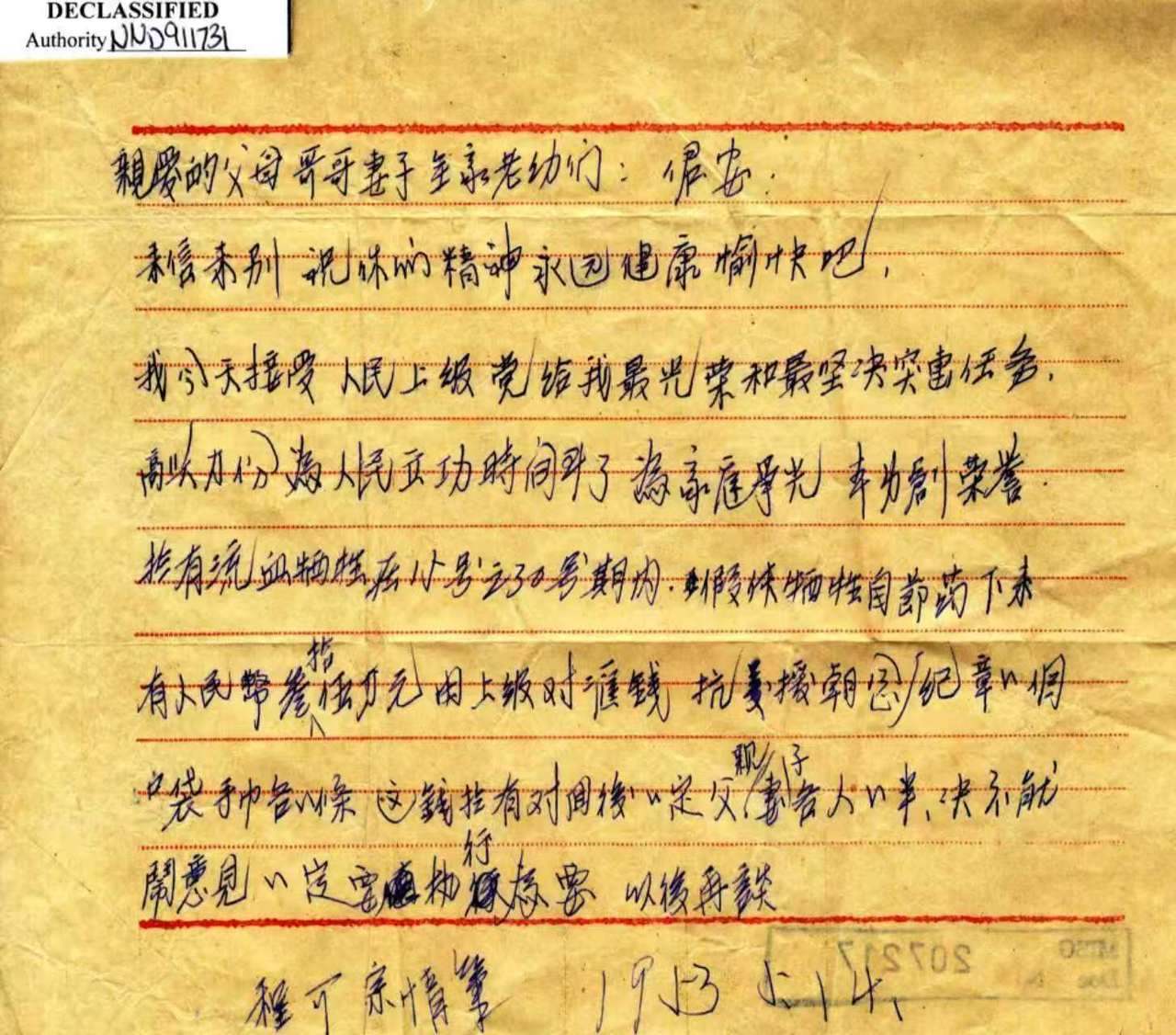 “亲爱的父母哥哥妻子全家老幼们……我今天接受人民上级党给我最光荣和最坚决突击任务,高兴万分,为人民立功时间到了……”