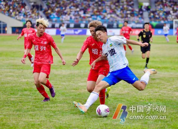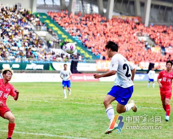第21分钟,绍兴队获得前场定位球机会,宁波队的解围踢到绍兴队球员脚下,后者的射门打中左侧横梁弹出。