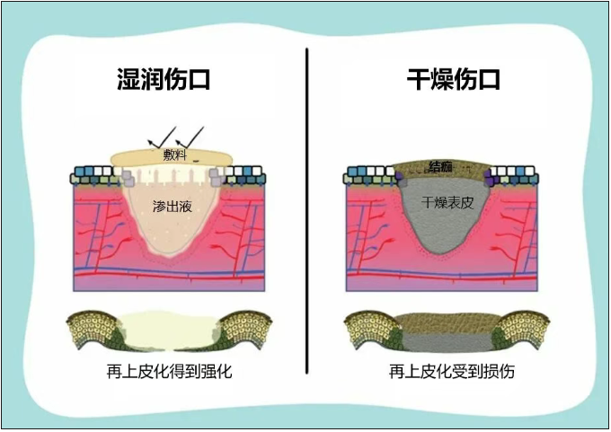 为什么湿润环境更好?研究显示,在干性环境下,角质形成细胞(最主要的上皮细胞)会艰难地进行再上皮化,缓慢地从干燥的硬痂下方迁移,并且结痂后也会引发痛感、增加组织二次损伤的风险。相反,湿润环境能很好地促进上皮细胞的迁移、胶原蛋白的合成以及自溶性清创等。