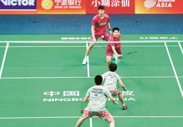 中国组合冯彦哲/黄东萍(红衣)以2:0战胜泰国组合帕克卡波/沙西丽,晋级混双比赛16强。(徐能 徐诚 摄)