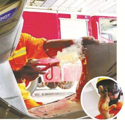 实验中,消防员将肉片穿在长尺状的铁片上,用橡皮筋箍紧。然后用老虎钳夹着伸进充电口。“砰”的一声,顿时火星四溅,冒起一阵青烟。拿出一看,铁片前端已经变成灰白色,肉片也烧黑了一大片。