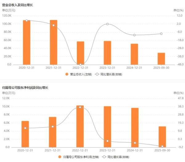 财报显示,2020年至2024年,镇海股份营收从10.96亿元降至5.18亿元,但归母净利润从6512.41万元增至9723.68万元。2025年业绩中报显示,工程总包业务收入为镇海股份的主要收入来源,营收占比超七成。2025年前三季度,受行业周期影响,公司营收同比下降9.96%至2.95亿元,归母净利润同比减少8%至5168.77万元。