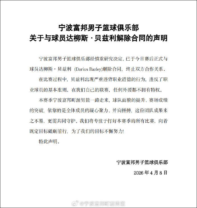 赛后,宁波男篮发布声明,宣布与球员达柳斯·贝兹利解除合同的声明。