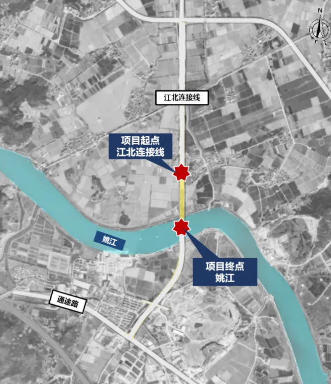 江北段北起江北连接线、南至姚江,道路长约0.58公里,区位图和选址平面图分别如下: