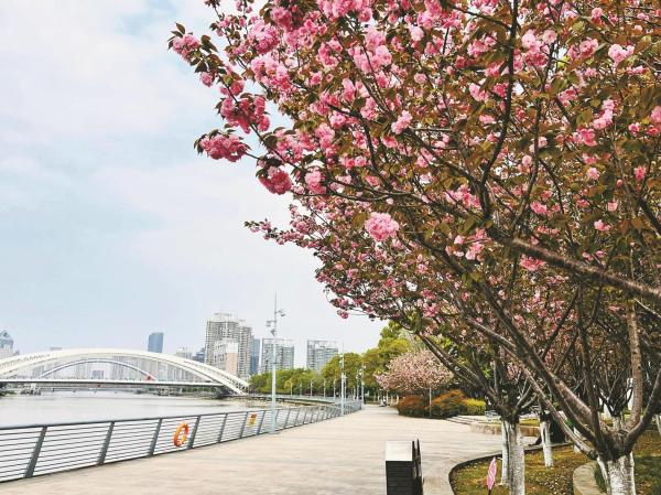 奉化江生态走廊的晚樱。记者边城雨 摄