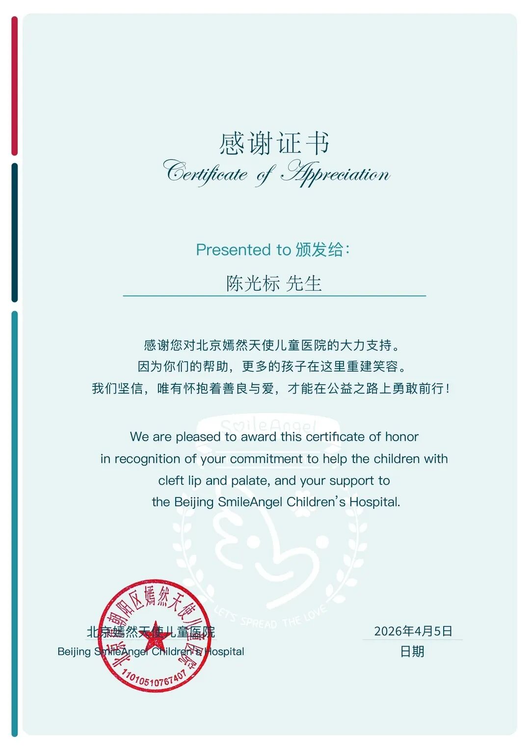 证书内文写到:感谢您对北京嫣然天使儿童医院的大力支持。因为你们的帮助,更多的孩子在这里重建笑容。我们坚信,唯有怀抱着善良与爱,才能在公益之路上勇敢前行!