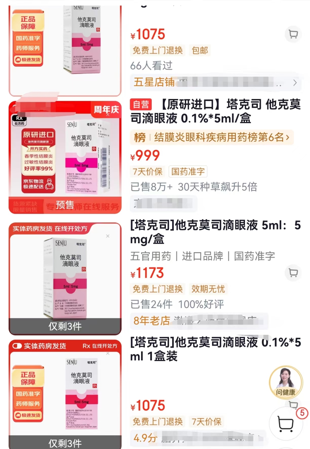 近期,他克莫司滴眼液从700多元暴涨至3000多元的消息受到广泛关注。澎湃新闻记者在电商平台看到,目前这款产品的价格普遍在一千元左右。