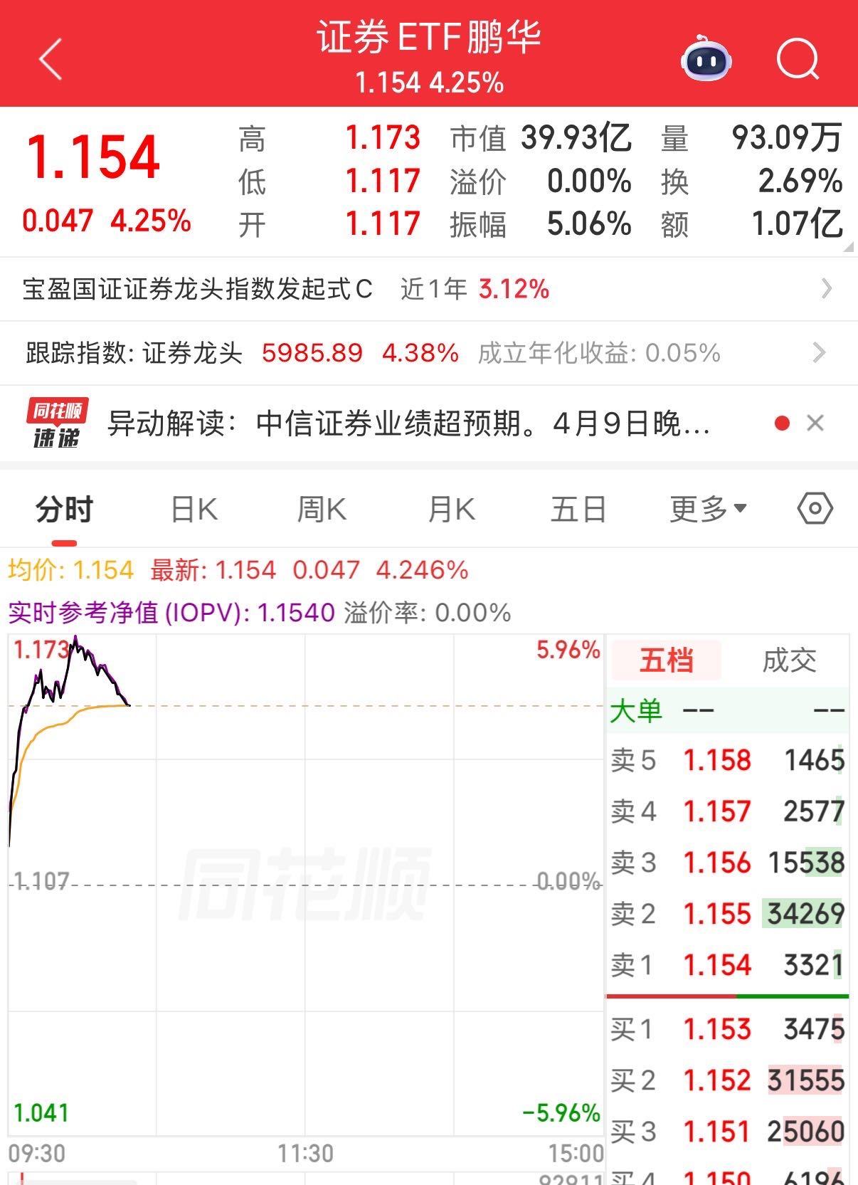 证券ETF鹏华(159993)上涨4.16%,最新报价1.154元。